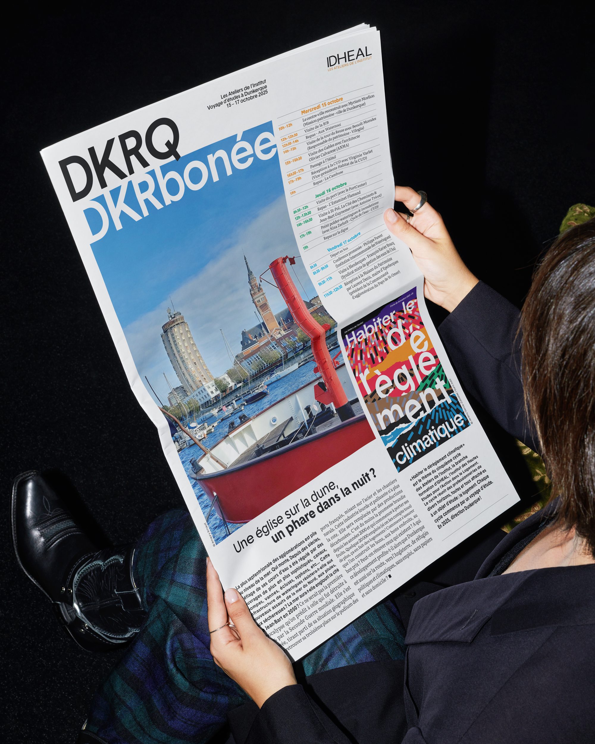 Conception d’un journal pour le voyage d’études à Dunkerque entre le 15 et 17 octobre 2025 avec les étudiant·es. Un journal de 4 pages avec des informations sur les visites de lieux, les projets architecturaux en cours ou passées ou une chronologie historique de Dunkerque.
